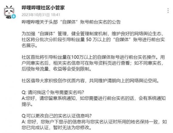 哔哩哔哩:分批次分阶段引导粉丝量50万以上的“自媒体”前台实名展示
