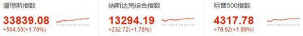 道琼斯指数收于33839.08点,上涨564.50点,涨幅1.70%;标准普尔500指数收于4317.78点,涨幅1.89%,创今年4月27日以来最大单日百分比涨幅;纳斯达克指数收于13294.19点,涨幅1.78%。