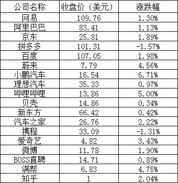 其他热门中概股中,哔哩哔哩上涨5.00%,满帮上涨4.75%,汽车之家上涨2.22%,知乎上涨2.04%,百度上涨1.98%,BOSS直聘上涨0.89%,新东方上涨0.42%,携程下跌1.31%。