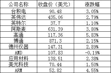 美股中的主要芯片股表现如下: