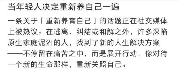 不过,就像这英一样,现在年轻人的一个不可阻挡的势头是,走出原生家庭阴影的渴望压倒了阴影本身,大家已经开始在积极自救。