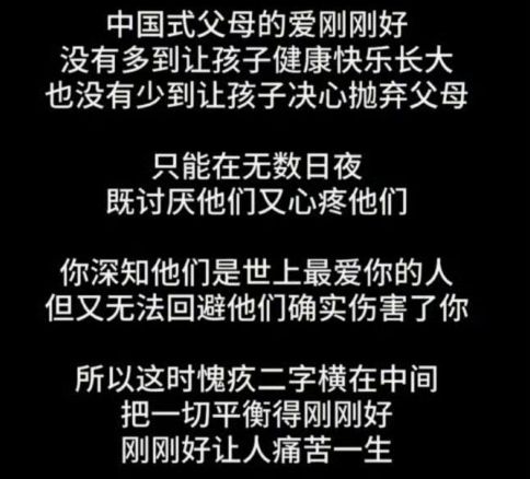 这些话都引起了无数共鸣,父辈的自我牺牲、情感勒索、道德绑架,筑起了一道密不透风的成长保护壳。