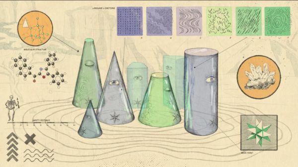 这些古怪的几何生物被描述成“蓝色、透明的锥形”,尖端朝上。每个生物体型大约是人类的一半大小,带有一些条纹状的标记,还有“在底部附近有一个如正午太阳般耀眼的星星”。