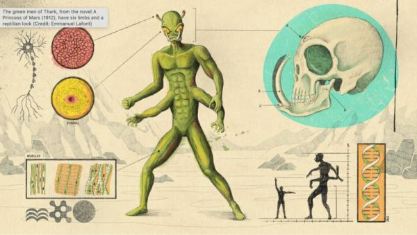 《火星公主》(A Princess of Mars,1912)中的萨克(Thark)绿色外星人具有六条肢体和爬行动物的外表。© Emmanuel Lafont