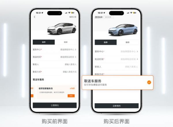 通过:“极氪 App”-“爱车”-“用车服务”-“一键维保”勾选取送车服务,提交后进入取送车预约服务界面。