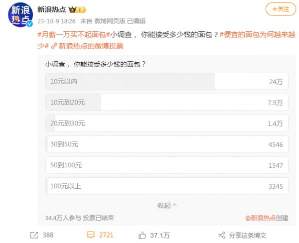 前段时间,新浪热点在微博上发起了一项“你能接受多少钱的面包”调查,截至10月9日,共有34.4万网友完成投票。其中,选择“10元以内”和“10元到20元”的网友共占比超九成。也就是说,绝大部分网友能接受的面包价格在20元以内。