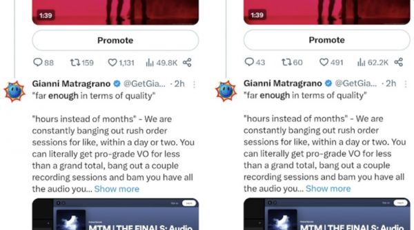 虽然他们认为使用 AI 配音可以提高生产力,但 Gianni Matragrano 却不太赞同,因为他的帖子被限流了,留言、转发、点赞直接来了个对半砍。