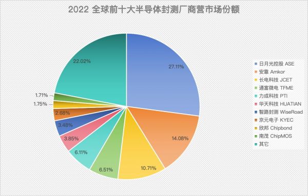 封测厂主要负责将代工厂生产的成品晶圆封装成最终的成品器件,并进行可靠性测试,这一环节相对于晶圆代工门槛更低,国产化率更高,除了美国的安靠(Amkor)外,主要集中于中国大陆和中国台湾。