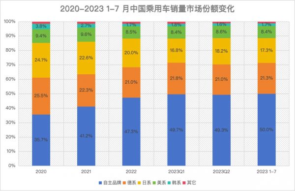 根据乘联会,2020年中国乘用车市场自主品牌销量份额为35.7%,2022年则迅速跃升至47.3%;2023年7月,自主品牌市场份额达到创纪录的53.2%,首次超过50%。此消彼长,日系品牌从2020年的 24.1%大幅锐减至17.3%,德系、韩系、美系品牌也均有明显下滑。