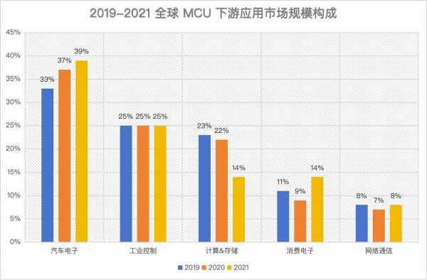MCU的下游应用极为广泛,主要覆盖汽车电子、工业控制、消费电子、计算与存储、网络通信六大市场,从全球来看,MCU下游市场中汽车电子占比最高。