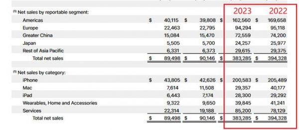 这点也体现在了财报上,大中华区财年总收入 725.59 亿美元,比起上财年直接少了 16.41 亿美元,降幅超过了美洲、欧洲、日本三大市场,只有亚太其他地区市场略有增长。