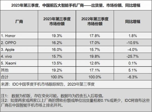 而另外一份则指出,同期第三季度中国智能手机市场出货量约 6705 万台,继续同比下滑 6.3%。其中苹果以 16%的市场份额位居第三,同比降幅达 4.0%,好于 OPPO 与 vivo,差于荣耀和小米。