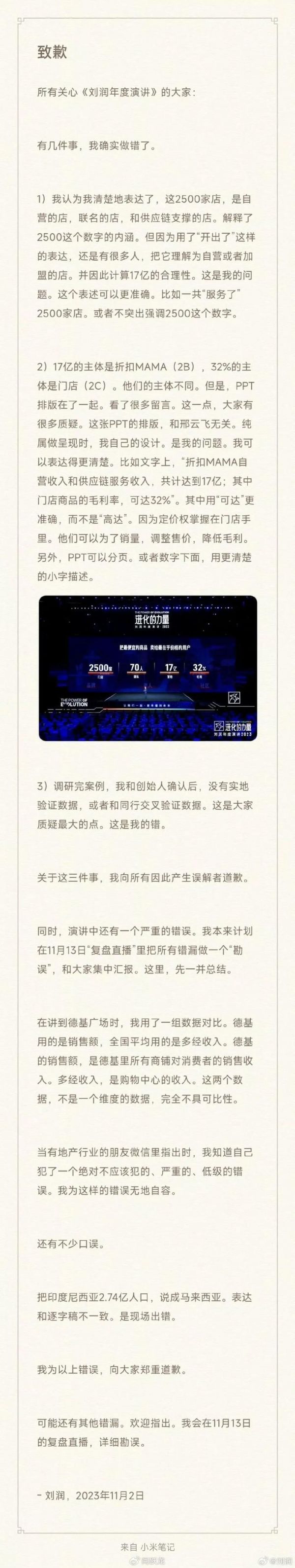 演讲里和全文稿里都有解释。这2500家店,包括:自营的店,联名的店,和供应链支撑的店。这个数字,经过邢云飞本人确认。收到反馈后,再次和邢云飞确认。现在这三种店的数量,已经超过4000家。总营收超过17亿多。用加盟店的模式去理解,对数据可能会产生误解。
