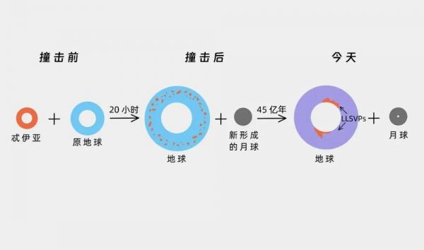猛烈的撞击导致忒伊亚的大部分物质与地球地幔结合在一起,地球上地幔的熔化层将一些物质卷入,变成地球物质;还有一部分来自忒伊亚的物质则通过地球地幔的熔化层,下沉到基本为固体的下地幔底部,然后在那里聚集并结晶,最终形成我们今天在地核与地幔边界探测到的两个独立的LLSVPs;与此同时,一些由撞击产生的忒伊亚的剩余碎片则被抛入轨道,聚结成了月球。