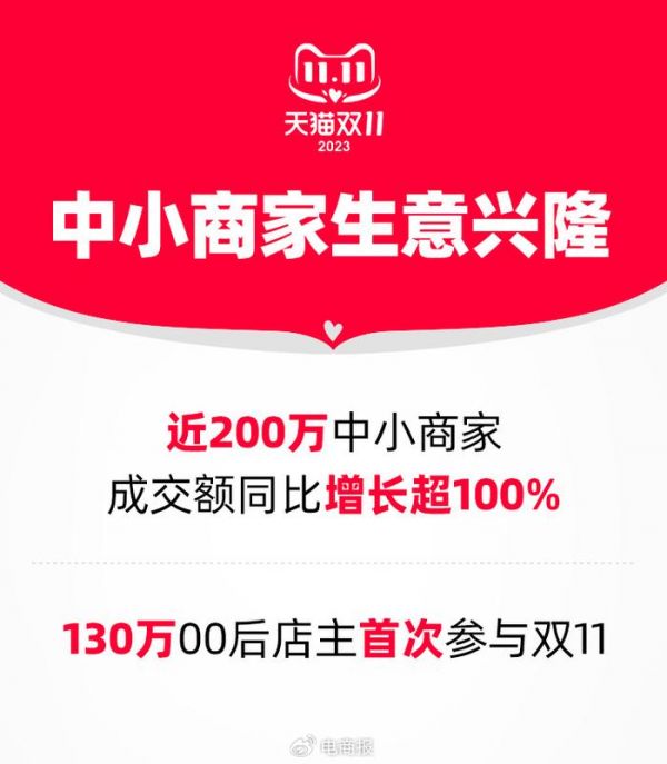 11月3日,天猫双11公布了一组数据:双11正式开启以来,已经有近200万中小商家成交同比增长超过100%。尤其是淘宝新商家,有372个新店铺开卖成交即破百万,130万00后商家首次参与双11,迎来开业大吉。