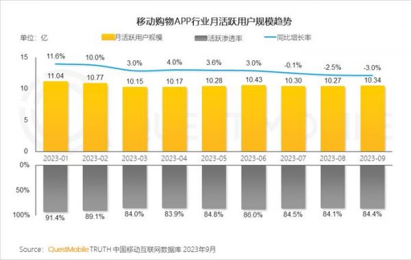 QuestMobile最新发布的《2023中国移动互联网秋季大报告》显示,移动购物APP行业月活跃用户规模整体增速放缓,进入存量时代,前三季度,移动购物APP行业活跃渗透率整体维持在84%左右。