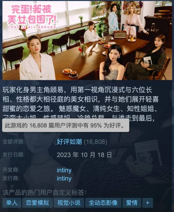 这款名叫《完蛋!我被美女包围了!》(以下简称《完!美!》)的游戏来自本土开发商Intiny,官方定位为“模拟恋爱的全动态真人互动影像作品”,正式售价42元。一经推出,它便以黑马之姿掀起了现象级热潮。