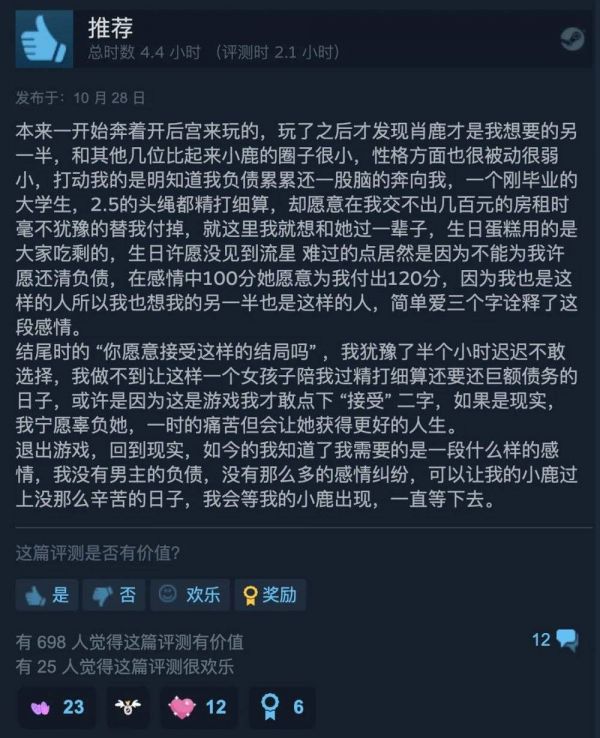 游戏上线后,这样一句短短的评论被顶到了Steam评论区前排:“因为我的青春太安静了,我想看看别人的青春中明目张胆的偏爱。”很多人在这里写下长长的心路历程,用老派的方式书写情书一般的告别信,感谢游戏里被自己选择、也毫无保留关心自己的角色。