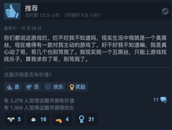 因而在《完!美!》流行起来后,常常有支持者以近乎”摆烂“的姿态进行消极反抗。他们姿态极低,不否认他者对游戏的负面评价,只是用自嘲口吻贬低”就吃这套“的自己,在人群中得到了不少共鸣。