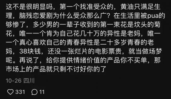可另一边,男性向内容受众也面临着属于自身的挤压感,他们长期面临着外部的惯性批评,难以信任向外沟通的价值。
