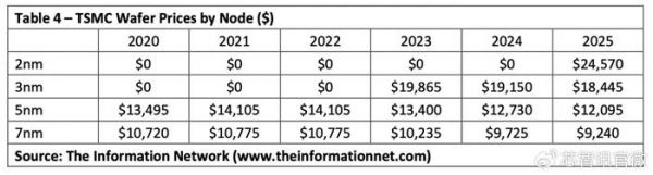 另外,3nm晶圆的制造成本也是非常的高昂。根据此前曝光的源自研究机构The Information Network的资料图显示,2023年台积电3nm的晶圆代工报价为平均19150美元每片晶圆,相比5nm的13400美元增长了42.9%。