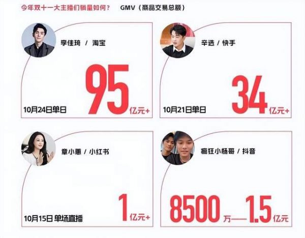 数据显示,双十一首日,李佳琦/淘宝单日GMV约95亿元,位居第一;疯狂小杨哥/抖音单日GMV约8500万-1.5亿元;辛选/快手单日GMV约34亿元。