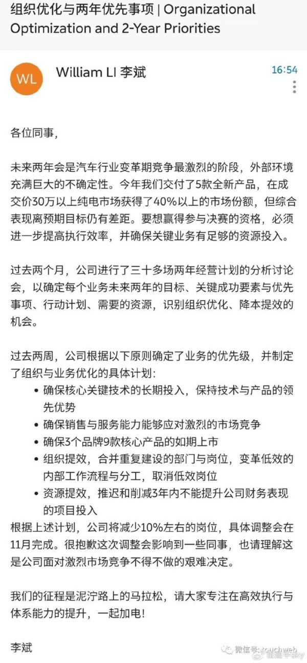 蔚来汽车创始人、CEO李斌今日发布全员信,宣布公司将减少10%左右岗位,具体调整11月完成。这意味着,蔚来可能有2000到3000人离职。