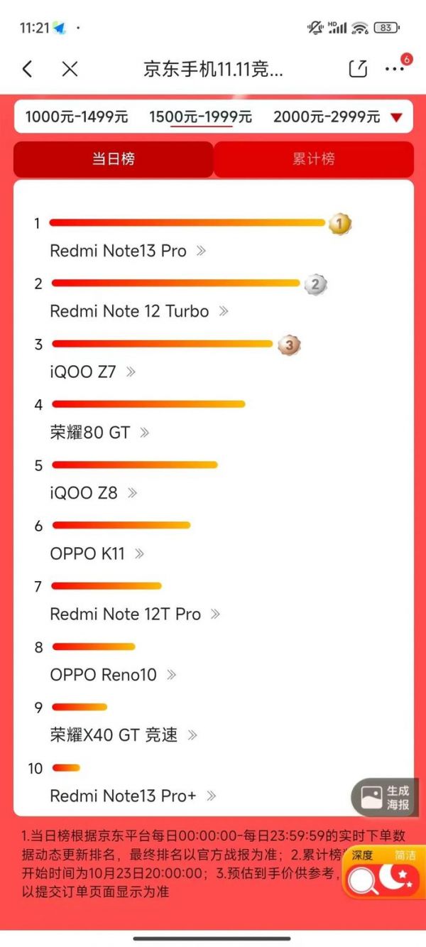 在1500-1999元价位,红米有4个,荣耀有两个,OPPO两个,iQOO两个,瓜分前十。