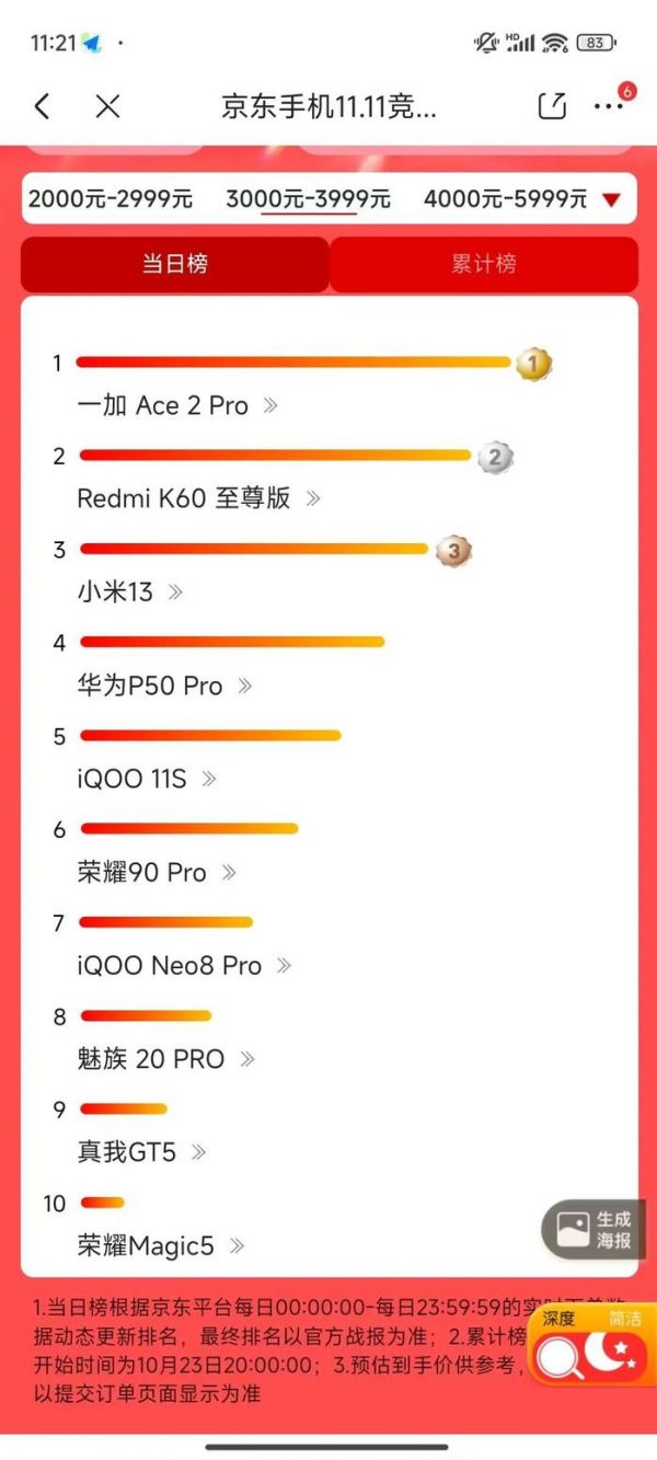在3000-3999元价位,红米小米两个,iQOO两个,荣耀两个,一加、魅族、真我、华为各一个。