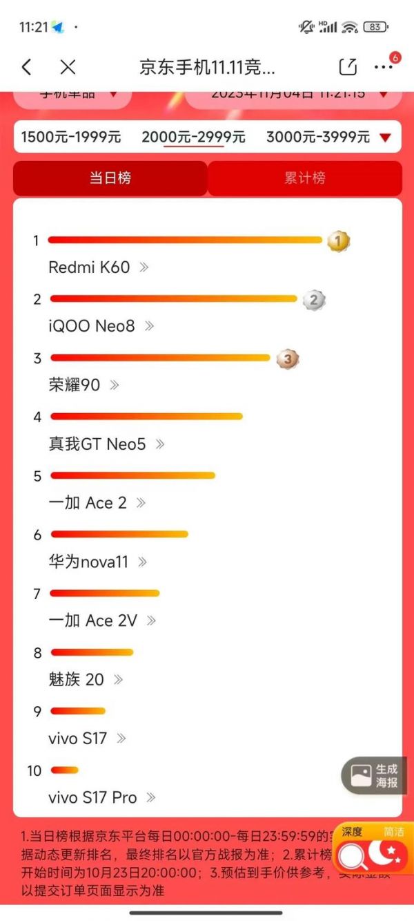 在2000-2999元价位,一加两个,vivo两个,但都排名靠后,红米、iQOO、荣耀、真我、魅族、华为各一个。