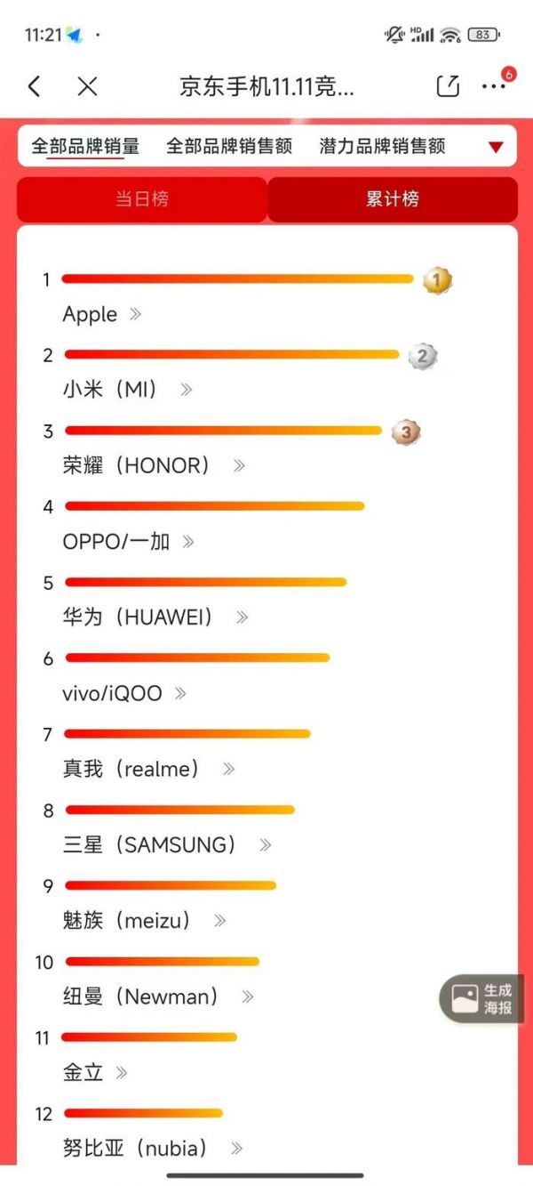 数据见真章,双11手机销量谁领先?苹果依旧是王者,小米稳居第二