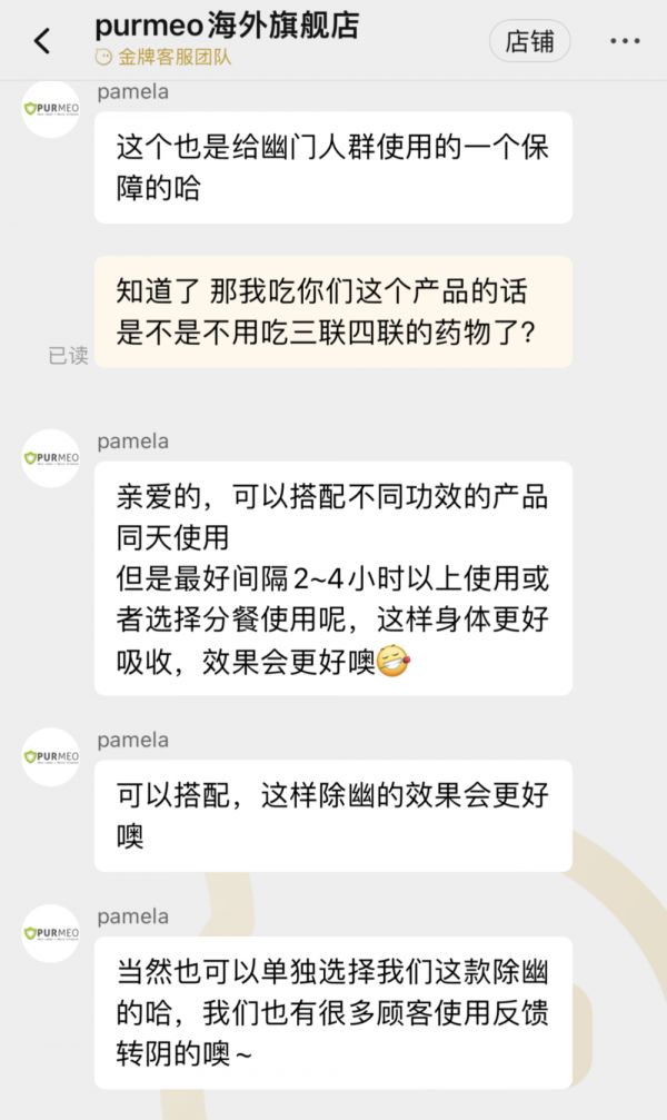 该品牌的前述活动是否暗示产品对幽门螺杆菌有治疗效果?对此,记者以消费者身份询问了客服。客服人员明确表示:“店铺在售的护胃胶囊添加专利Pylopass益生菌成分,经临床证实有效预防、清除幽门螺杆菌,告别传统抗生素三四联疗法,不含药物成分,不损伤身体,不会产生耐药性无副作用。”