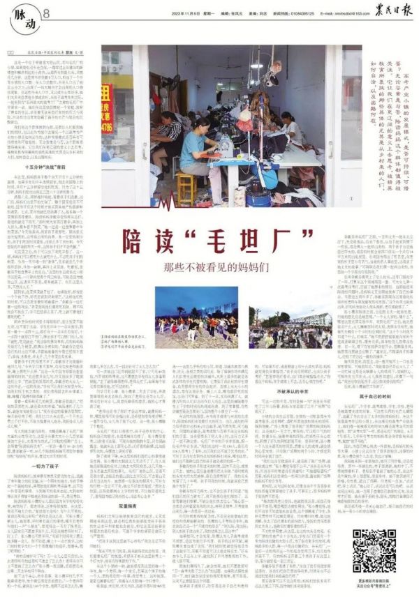有人的地方就有商机。大概是瞅准了毛坦厂镇大量的女性劳动力,这里分布着大大小小几百家服装加工企业,大都为作坊式,门口贴的招聘广告上,会写着“陪读妈妈优先”。一家店一般有10~20台机器,像李敏芬一样,10几个陪读妈妈每天都要伴着缝纫机“哒哒哒”的声音,度过大半天的时间。