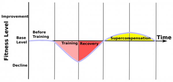 人体是可调节的有机体,在训练后会立即进入恢复阶段,并且不仅会恢复到初始水平,甚至超过初始阶段的体能水平。但如果在这一阶段(上图黄色区间)没有施加新的锻炼刺激,则该适应水平将缓慢回落到初始适应水平。