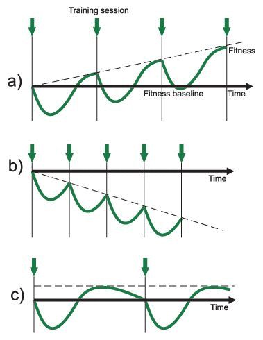 机体反应因为不同的恢复时间和训练强度而产生的性能改变。a阶段性能上升,b阶段性能下降,c阶段停滞不前。来源: All things Sports Physiotherapy