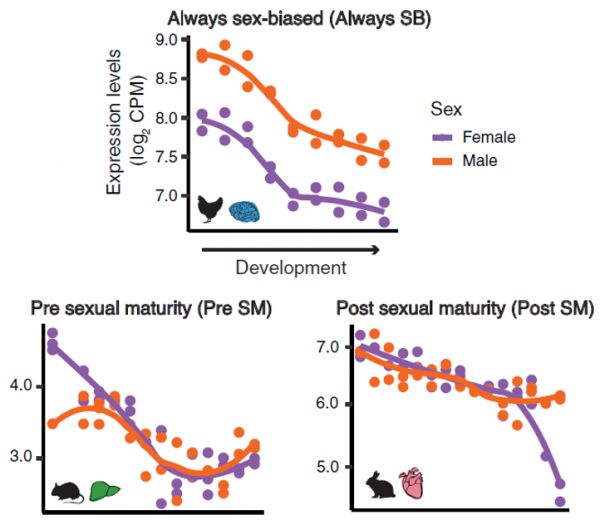 性别二态性可以通过性别偏倚基因,即在两性中表达量不同,主要在一个性别中活跃的基因数量来量化。最新研究分析了人类,哺乳动物(小鼠、大鼠、兔子和负鼠)以及鸡两性的基因表达活性随时间的变化,涵盖了大脑、小脑、心脏、肾脏和肝脏这5个器官在不同发育阶段的基因表达数据集。