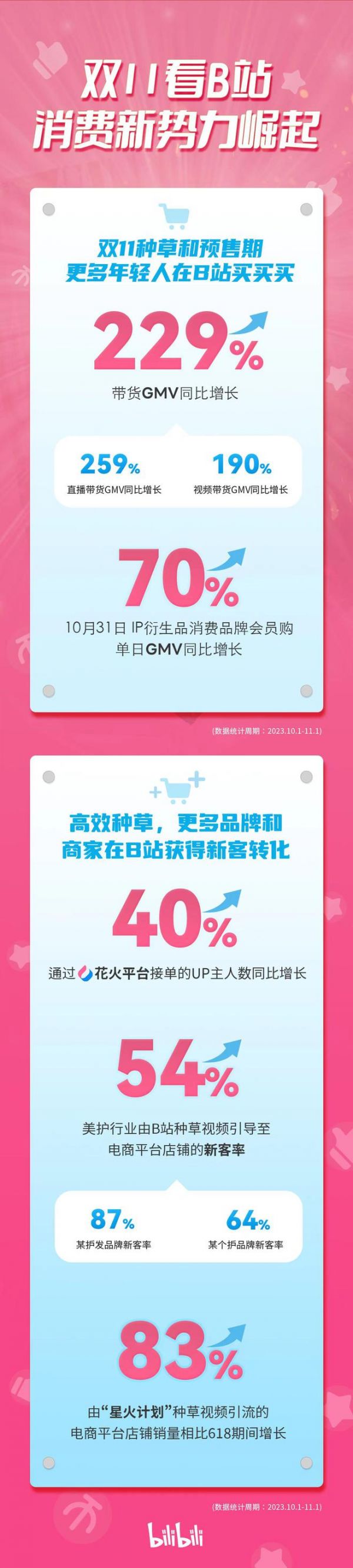 11月6日消息,随着“双11”各大电商平台的预售期收官,B站数据显示,在双11预售期的带货GMV同比增速高达229%。“星火计划”显示,双11预售期间,B站种草视频的引流为电商平台店铺带来的销售额,相比“618”整个大促期间已增长83%。
