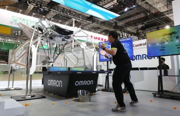 11月5日,工作人员(右)在第六届进博会上展示欧姆龙公司展出的第八代FORPHEUS乒乓球教练机器人。新华社记者 方喆 摄“创”造未来