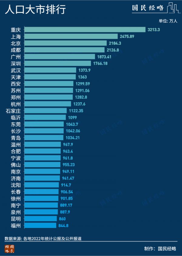 目前,内地共有24个万亿GDP城市,但其中人口突破千万的“双万城市”只有15个,南京、宁波、佛山、合肥、济南、泉州、福州等都不在其列。