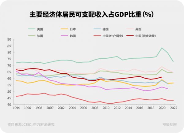 我国资金流量表口径下,居民可支配收入占GDP比重低点在2008年,为58.5%,而这实际上高于当年日本(56.5%)、韩国(53.7%)水平,接近德国(59.1%)水平。在2008年之后,资金流量表口径下居民可支配收入占比还有所回升,持续好于日本、韩国,至2020年平均高于日本3.6个百分点,高于韩国7.8个百分点。