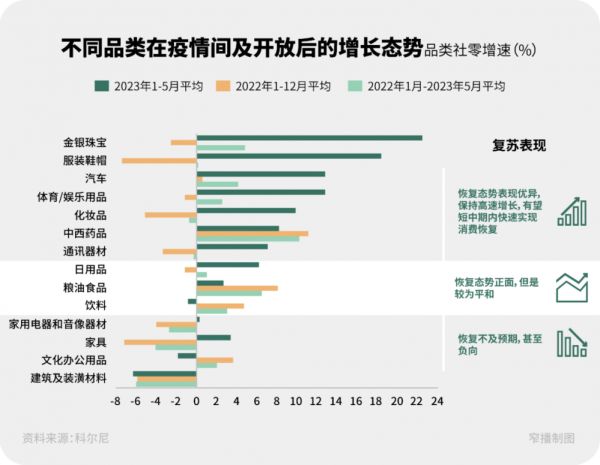 科尔尼的最新消费市场报告在研究了不同品类在疫情期间及开放后的增长态势后同样认为,不同品类恢复增速呈迥异的态势,恢复的节奏时间也表现出明显的差异。