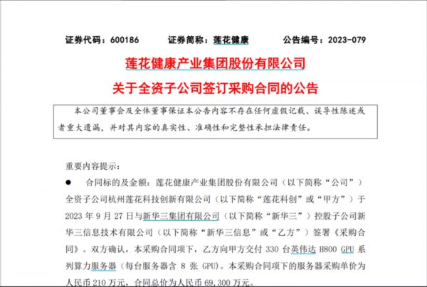 △ 莲花健康采购英伟达算力服务器,图源:节选自莲花健康发布公告