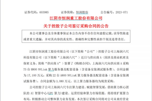 无独有偶,10月17日晚,法兰及锻件生产制造商恒润股份披露,控股子公司上海润六尺科技有限公司(以下简称上海润六尺)欲斥资超过2亿元向供应商A购买算力服务器及配套设备。