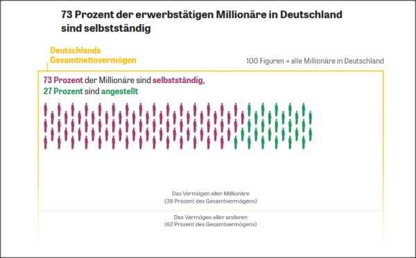 根据图表的显示,有73%的德国百万富翁是个体经营者,只有27%的富人受雇于人,不过都是公司高管。