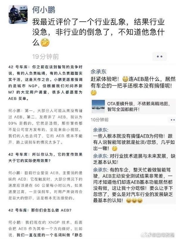 余承东炮轰车企一把手不懂AEB 何小鹏回击:不知道他急什么