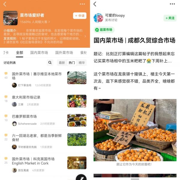 3月份,小红书美食组就发起过一场“菜市场漫游指南”活动,鼓励用户分享有关菜市场的旅游、生活故事。