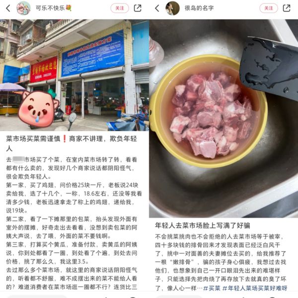 在小红书搜索“菜市场”,除了有治愈人心的菜市场生活碎片,也有“冤种”年轻人踩雷后的劝退指南。