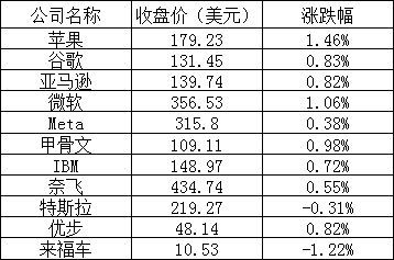 大型科技股普遍上涨,苹果和微软涨幅超过1%,谷歌、亚马逊、Meta和奈飞涨幅不到1%。