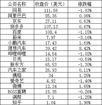 其他热门中概股中,知乎上涨1.96%,携程上涨1.25%,汽车之家上涨0.11%,新东方下跌1.30%,满帮下跌1.25%,百度下跌1.15%,哔哩哔哩下跌1.02%,BOSS直聘下跌0.26%。