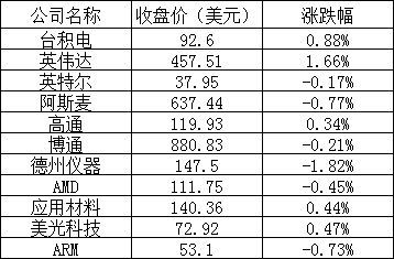 美股中的主要芯片股表现如下: